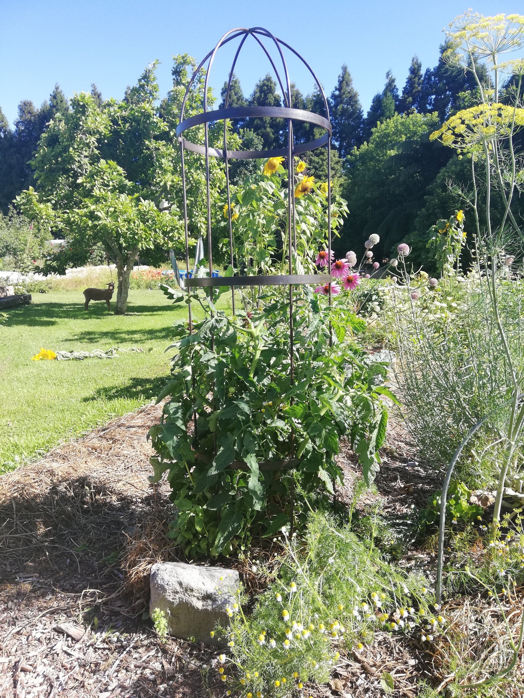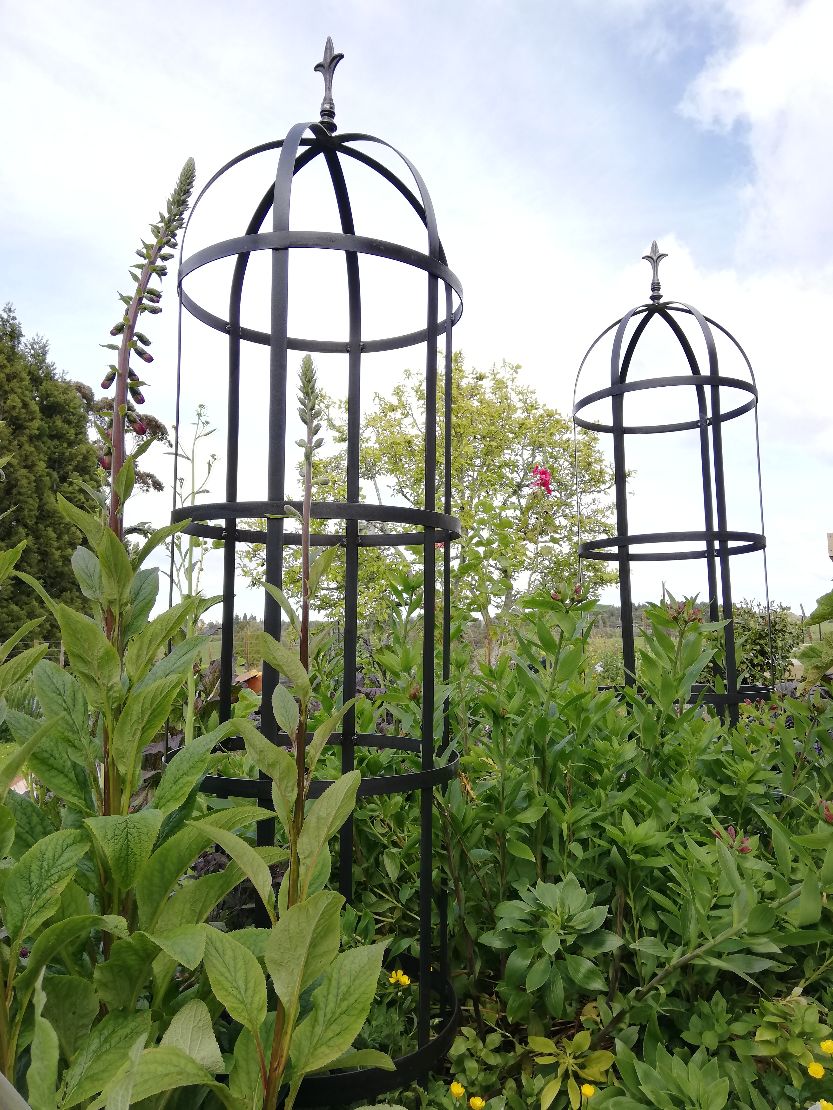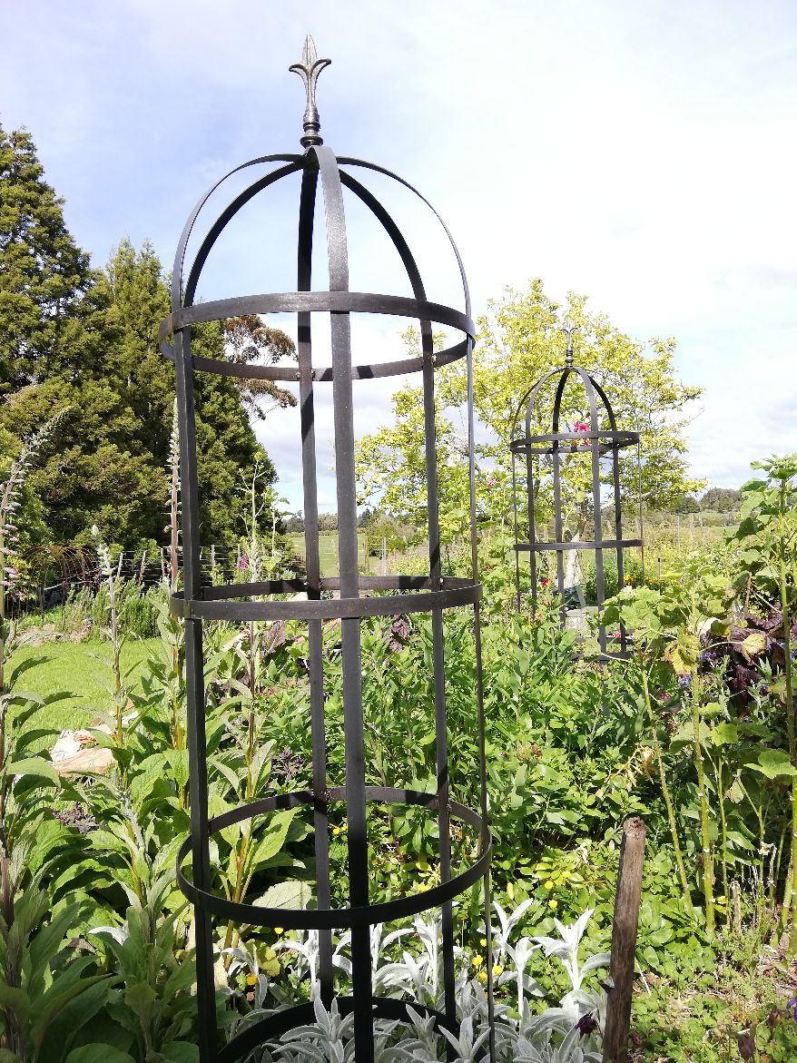 a beautiful uncoated steel plant cage. this will rust up nicely but go on lasting for years. Wonderful for growing a rose or tomato inside or a vine over, or really a compelling piece in your garden that creates height and interest. The Italian wrought iron finial finishes it magnificently! You can choose between our spike, traditional fleur de lis or cross finials. #Sorry we are having trouble with our online store, please contact Sally directy on 0278674196 or contact@thegardenproject.co.nz so we can help you, thank you!
